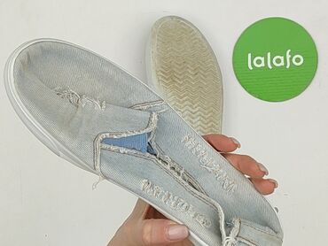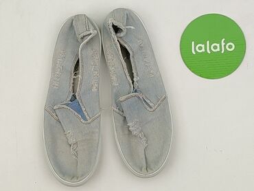 Białe damskie półbuty sznurowane, wykonane z perforowanego materiału, który zapewnia przewiewność. Buty posiadają białe sznurowadła i niską, wygodną podeszwę z wyraźnym bieżnikiem, co sprawia, że s...Damskie buty wsuwane wykonane z materiału imitującego sprany jeans w jasnoniebieskim kolorze. Charakteryzują się ozdobnymi przetarciami, które dodają im unikalnego, swobodnego wyglądu. Buty mają białe podeszwy z wyraźnym, zygzakowatym bieżnikiem, zapewniającym dobrą przyczepność. Są lekkie i przewiewne, idealne do codziennego użytku w cieplejsze dni.