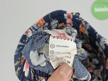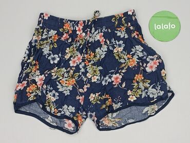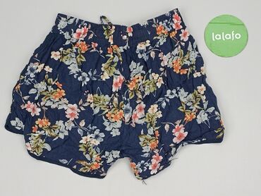 Szorty damskie w kwiaty - Kolor: granatowe tło z wielobarwnym, kwiatowym nadrukiem (odcienie różu, bieli, błękitu). - Fason: krótkie, lekkie, z falującą, marszczoną linią nogawek. - Pas: elastyczn...Stan: