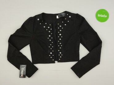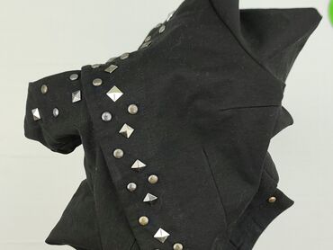 Krótki bolerko/żakiecik damski - Kolor: czarny, satynowy połysk - Krój: krótkie bolerko z krótkim rękawem, szeroki kołnierz/szala, wykrojony przód bez zapięcia - Rozmiar z metki: 34 - Skład materi...