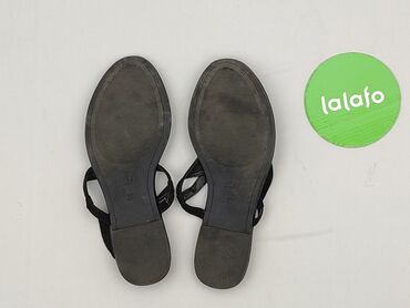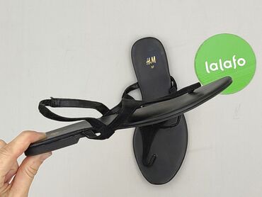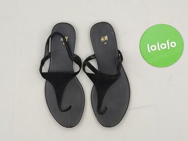 Sandały damskie H&M - Model: płaskie sandały z paskami - Kolor: neonowa limonka/żółty z białymi akcentami - Materiał wierzchni: tworzywo sztuczne (paski), wkładka w kolorze jasnego brązu - Zapięci...Czarne sandały damskie marki H&M z paskami na palce, idealne na ciepłe dni. Posiadają płaską podeszwę, co zapewnia komfort noszenia przez cały dzień. Wyposażone w pasek wokół pięty, który pomaga utrzymać stopę w miejscu, zapewniając stabilność i wygodę. To praktyczny wybór na lato, pasujący do wielu codziennych stylizacji.