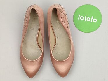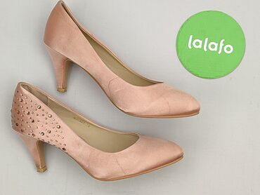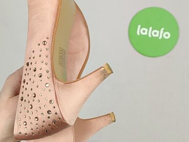 Złote czółenka damskie z migoczącym wykończeniem - Rozmiar: 38 (oznaczenie na podeszwie) - Fason: czółenka z ostrym, szpiczastym noskiem - Obcas: niski, stabilny klocek ok. 3–4 cm - Cholewka: mate...