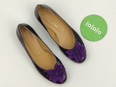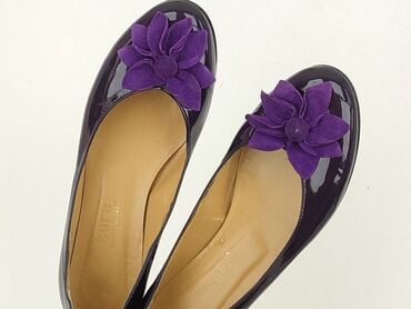 Baleriny damskie z lakierowanej skóry w kolorze głębokiego fioletu (śliwki). Ozdobione na nosku dużą, miękką aplikacją w kształcie kwiatka z zamszu w intensywnym, purpurowym odcieniu.