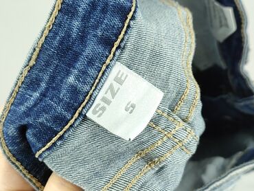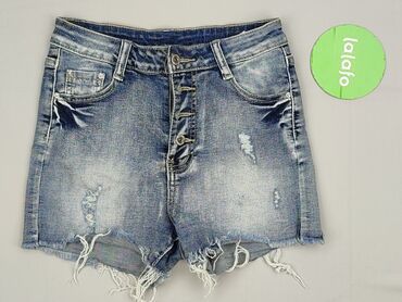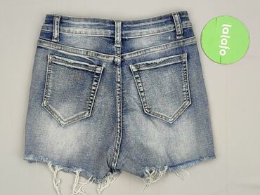 Jeansowe szorty damskie, rozmiar S. - Krój z wysokim stanem - Kolor: jasny denim z delikatnymi przetarciami - Zapięcie: suwak + metalowy guzik - Szlufki na pasek - Przód: 2 klasyczne kieszenie + m...