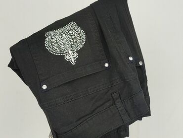 - Ozdoby: metalowe nity z kryształowym połyskiem z przodu; na tylnych kieszeniach duże aplikacje w formie korony wysadzane dżetami