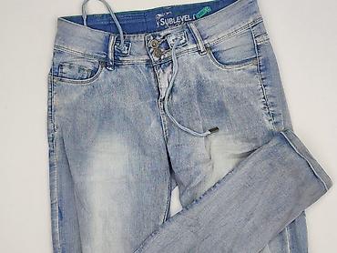 Damskie jeansy Sublevel – rozmiar S - Kolor: jasny denim z modnymi przetarciami i cieniowaniem - Krój: rurki/skinny, dopasowane nogawki - Stan: średni (mid waist) - Zapięcie: suwak + guzik, szlufk...