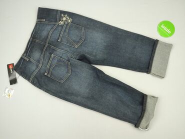 Damskie spodnie jeansowe 3/4 z ozdobnymi lampasami - Fason: capri/rybaczki, długość 3/4 - Kolor: jasny niebieski denim z delikatnymi przetarciami - Detale: ozdobne lampasy po bokach z małymi srebr...