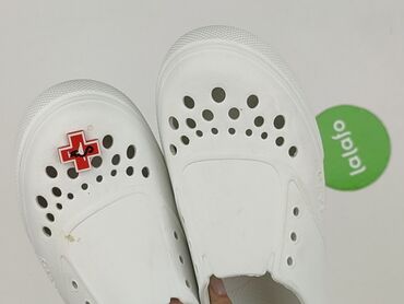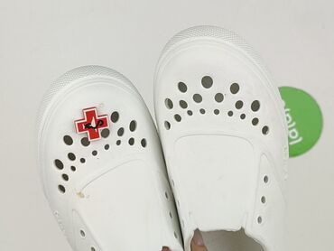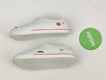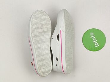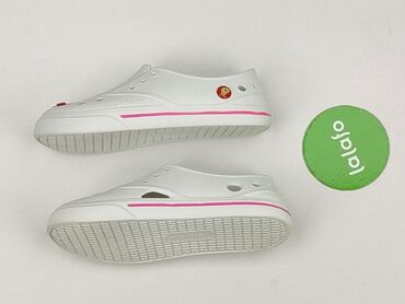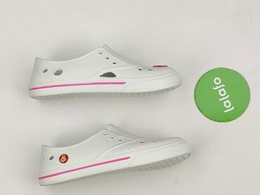 Białe klapki typu „crocs” z paskiem na piętę - Rozmiar: 36 (oznaczenie na podeszwie) - Kolor: biały - Materiał: lekka pianka tworzywowa - Przewiewna cholewka z licznymi otworami - Ruchomy pasek – ...