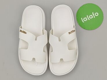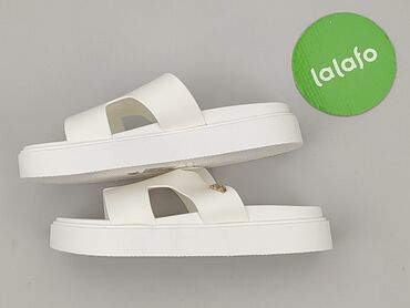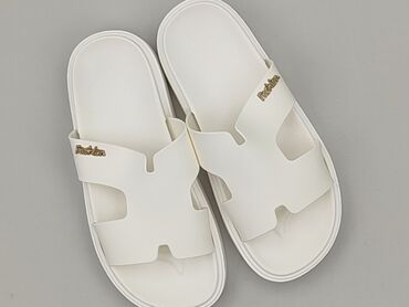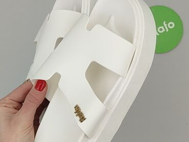 Białe klapki damskie na płaskiej podeszwie - Rozmiar: 40 (oznaczenie na spodzie) - Kolor: biały - Model: wsuwane klapki z dwiema szerokimi paskami na podbiciu - Cholewka: syntetyczna/skóra ekologi...