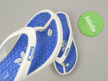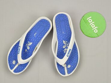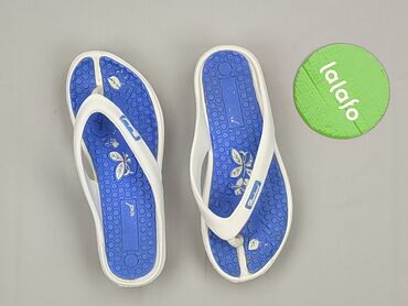 Japonki damskie z tropikalnym nadrukiem - Kolorystyka: wielobarwny nadruk w liście i kwiaty (róże, zielenie, niebieskości, żółcie), paski w kolorze granatowym/błękitnym z połyskiem - Rozmiar: 37 (...