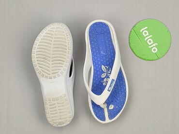 Japonki damskie z motywem tropikalnym - Rozmiar: 39 (oznaczenie na wkładce) - Przeznaczenie: dla kobiet (nie dziecięce) - Kolorystyka: biała podeszwa z nadrukiem liści i kwiatów w odcieniach ziele...