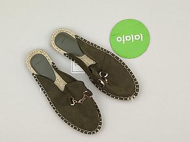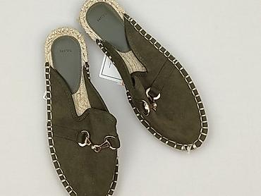 Klapki damskie bpc, rozmiar 41. - Model: mule/klapki wsuwane - Cholewka: dwa krzyżujące się paski z zielonej tkaniny z dekoracyjnymi, strzępionymi krawędziami - Wkładka: beżowa, z oznaczeniem „bpc...