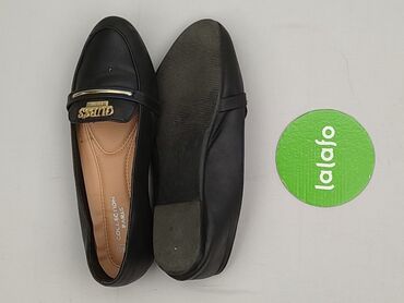 Czarne mokasyny damskie z ozdobnym łańcuchem - Klasyczny fason loafersów - Cholewka: czarny zamsz/sztruks o matowym wykończeniu - Na podbiciu masywny, połyskujący złoty łańcuch – efektowny akcent ...Stan: