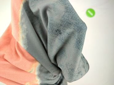 To damskie poncho wyróżnia się swobodnym krojem i wzorem tie-dye, łączącym odcienie brzoskwini, bieli i szarości. Luźny fason z krótkimi rękawami zapewnia komfort noszenia i swobodę ruchów. Dekolt w kształcie litery V z ozdobnym, metalowym elementem nadaje całości elegancki akcent. Czarne lamówki wokół dekoltu i rękawów podkreślają kształt poncho. Jest to idealny wybór na co dzień, na plażę lub jako element stylizacji na wakacyjne wyjazdy, doskonale sprawdzi się w cieplejsze dni.