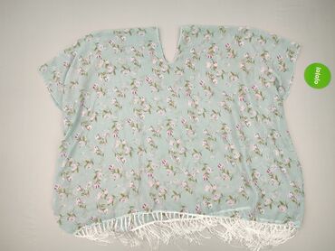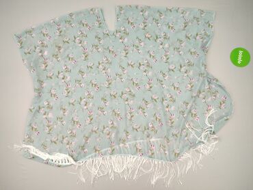 Lekkie damskie poncho w odcieniu jasnoniebieskim, ozdobione delikatnym kwiatowym wzorem w odcieniach fioletu i zieleni. Fason z dekoltem w serek i krótkimi, szerokimi rękawami zapewnia swobodę ruchów. Dolna krawędź wykończona jest białymi frędzlami, dodającymi mu lekkości i stylu. Idealne jako narzutka na strój kąpielowy lub letni top, sprawdzi się doskonale na plaży, basenie, czy podczas spacerów w ciepłe dni.