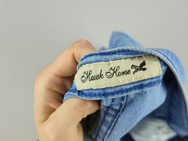 Jasnoniebieskie rybaczki dżinsowe marki Hawk Horse, zapinane na zamek błyskawiczny i guzik, z pięcioma kieszeniami: dwoma z przodu, jedną małą na monety i dwiema z tyłu. Nogawki zakończone podwójnym mankietem z ozdobnymi guzikami. Spodnie są ozdobione małymi cyrkoniami przy przedniej kieszeni oraz haftem na tylnych kieszeniach. Są to praktyczne i wygodne spodnie, idealne na co dzień.