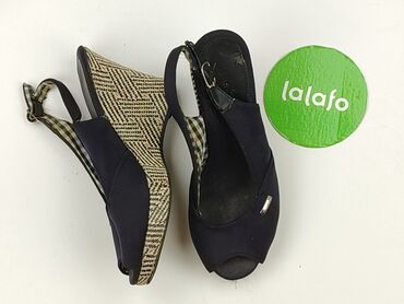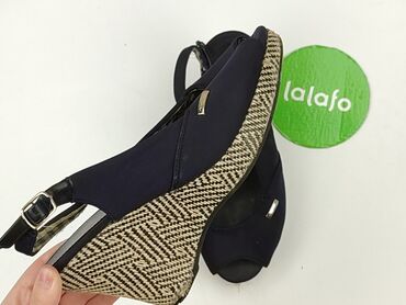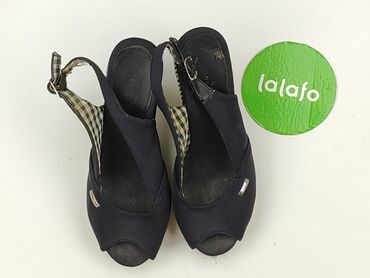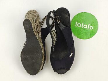 Sandały na koturnie Jenny Fairy - Model: peep toe na koturnie - Rozmiar: 38 (oznaczenie na podeszwie) - Kolor cholewki: kobaltowy/ciemnoniebieski - Materiał cholewki: zamszopodobny - Koturn: korek...