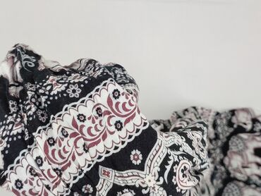 Lekkie, luźne spodnie damskie 3/4 typu haremki/boho. - Wzór: etniczne mandale w odcieniach różu i czerni, połączone z bordiurą w niebieskie kwiaty na czarnym tle. - Krój: szerokie nogawki, długość...