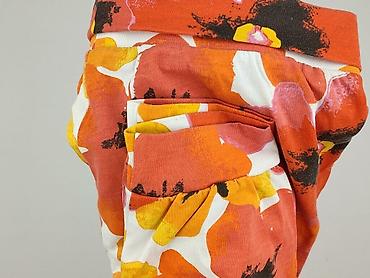 - Kolorystyka: białe tło, duże kwiaciane printy w odcieniach pomarańczu, czerwieni i żółci z czarnymi akcentami