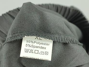 Damskie spodnie materiałowe, kolor ciemnoszary/grafitowy. Model z prostą, szerszą nogawką i marszczoną gumką w pasie dla wygody. Z przodu subtelne zaszewki poprawiające ułożenie. Tkanina elastyczna i gładka: 95% poliester, 5% spandex (metka na zdjęciu). Rozmiar z metki: XL.