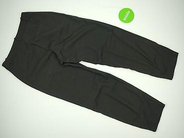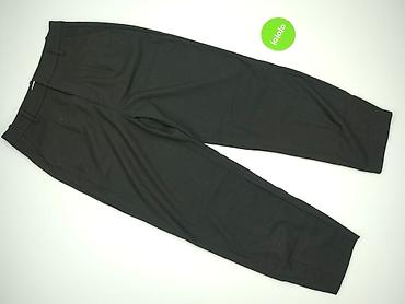- Fason: klasyczne materiałowe spodnie z zakładkami z przodu, lekko zwężane nogawki
