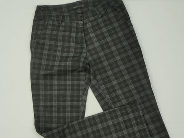 Spodnie w kratę – damskie, rozmiar M - Krój: zwężane nogawki, średni stan - Pas: elastyczny (gumka), bez zapięcia – wygodne dopasowanie - Wzór: klasyczna szkocka krata w odcieniach szarości, grana...Stan: