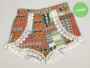 Szorty damskie z lekkiego materiału, wzór boho/paisley. - Rozmiar: M (na metce) - Skład: 100% poliester - Talia: szeroki, marszczony pas na gumce z wiązaniem z przodu - Krój: luźny, bardzo zwiewny...