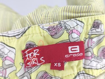 Szorty damskie CROPP, rozmiar 36. - Kolor: słoneczny żółty - Wzór: drobne białe i pastelowe kwiaty z zielonymi listkami - Krój: luźny, zfalowany dół z wycięciem w kształcie łezki i falbankową lamów...Szorty damskie w kolorze jasnożółtym z delikatnymi pionowymi paskami. Posiadają zamek błyskawiczny i guzik do zapięcia. Wnętrze pasa wykończone jest materiałem z nadrukiem przedstawiającym buty sportowe, co dodaje im unikalnego charakteru. Na tyle spodenek znajduje się subtelny napis "cropp girl". Model ten wyposażony jest w praktyczne kieszenie, idealne na drobne przedmioty.