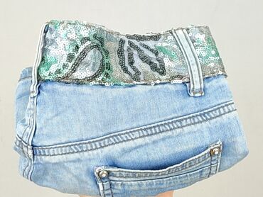 Szorty jeansowe w jasnoniebieskim odcieniu z ozdobnym, cekinowym pasem w kolorze zielono-srebrnym. Model z pięcioma kieszeniami: dwoma z przodu, małą kieszonką na monety oraz dwiema z tyłu. Zapinane na dwa ozdobne guziki i zamek błyskawiczny. Szorty posiadają szlufki na pasek oraz przetarcia na udach, nadające im modny wygląd. Idealne na letnie dni, zapewniają wygodę i styl.