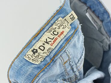 Jasnoniebieskie szorty jeansowe marki D*KLIC CLASSIC JEANS, rozmiar T38. Wykonane z mieszanki 95% bawełny i 5% elastanu, co zapewnia wygodę i dopasowanie. Krótkie spodenki posiadają dwie kieszenie z przodu, z czego jedna ozdobiona jest białym wzorem. Z tyłu znajdują się dwie naszywane kieszenie z zielonymi szwami w kształcie litery „V”, dodające unikalnego charakteru. Zapinane są na guzik i zamek błyskawiczny. Nogawki wykończone są wywiniętymi mankietami, które można rozłożyć. Idealne na co dzień, na ciepłe dni.