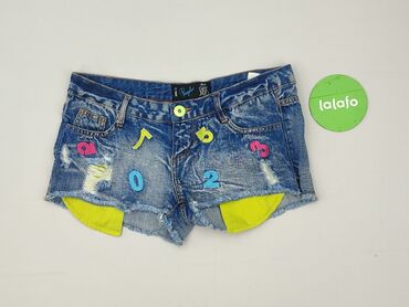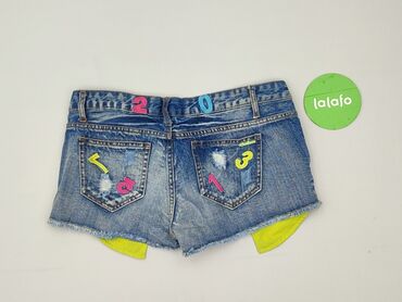 Krótkie spodenki jeansowe damskie HOUSE/DENIM - Model: denimowe szorty z haftami grzybków (pastelowe odcienie różu, fioletu i żółci) z przodu i z tyłu - Kolor: jasny, przecierany błękit - Krój: wy...