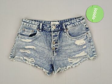 Szorty jeansowe damskie, jasny denim - Fason: klasyczne krótkie szorty z wysokim stanem - Kolor: jasnoniebieski, efekt sprania (acid wash) - Detale: modne przetarcia i lekkie dziury, postrzępione ...