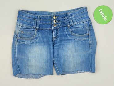 Jeansowe szorty damskie XS – JXX - Fason: wysoki stan, klasyczne 5 kieszeni - Zapięcie: suwak + metalowy guzik - Nogawki z podwinięciem - Denim w odcieniu średniego/ciemnego niebieskiego, kontrast...