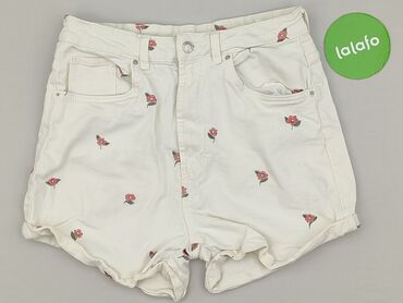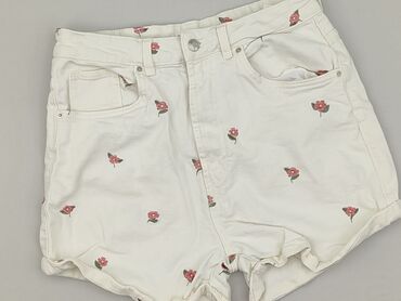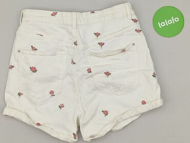 Białe jeansowe szorty damskie - Krój: bardzo krótkie, z postrzępionym dołem - Zapięcie: zamek błyskawiczny + guzik - Kieszenie: 5 (dwie z przodu, mała kieszonka zegarkowa, dwie tylne) - Szlufki na...
