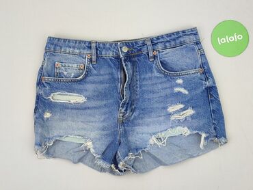 ZARA – jeansowe szorty damskie - Model: denimowe szorty z wysokim stanem - Kolor: jasny, sprany błękit z efektem „washed” - Fason: luźniejsza nogawka, mocno postrzępione krawędzie i przetarcia typ...