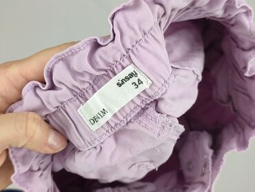 Fioletowe bawełniane szorty damskie Sinsay w rozmiarze 34. Charakteryzują się elastyczną talią, która zapewnia wygodę noszenia. Szorty posiadają praktyczne kieszenie z przodu oraz z tyłu, co zwiększa ich funkcjonalność. Wykonane w 100% z bawełny, zapewniają komfort i przewiewność, idealne na cieplejsze dni.