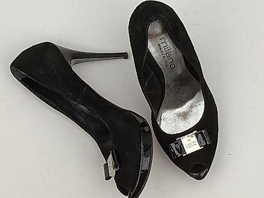 Czarne damskie szpilki QUAZI na platformie - Rozmiar: 37 (oznaczenie na podeszwie) - Typ: szpilki peep toe z wycięciami po bokach - Cholewka: zamsz/nubuk w kolorze czarnym - Wnętrze: skóra natural...