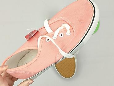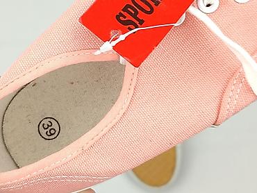 Różowe trampki damskie, rozmiar 39. - Klasyczny, niski fason z okrągłym noskiem - Cholewka z różowego materiału tekstylnego o delikatnym połysku - Biała, gumowa osłona palców - Sznurowane na białe...