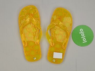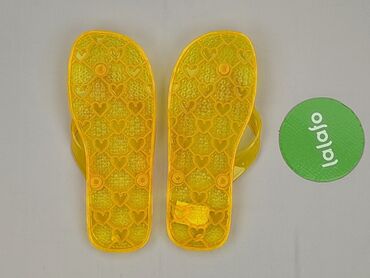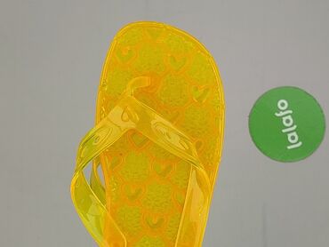 Żółte klapki japonki z przezroczystego tworzywa - Rozmiar: 37 (oznaczenie na podeszwie) - Kolor: intensywny żółty, półtransparentny - Materiał: miękkie, elastyczne tworzywo PVC - Wzór: serduszka n...Stan: