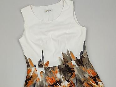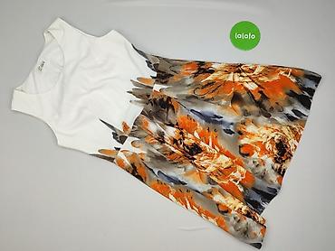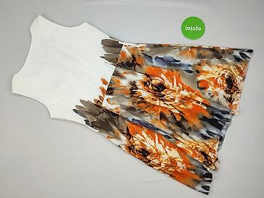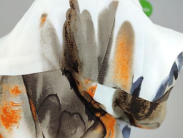 - Wzór: artystyczny, malarski print w odcieniach pomarańczu, szarości, brązu i czerni; góra gładka w kolorze ecru/śnieżnej bieli, kontrastowy pas przejścia wzoru w talii