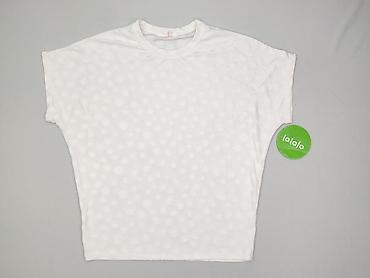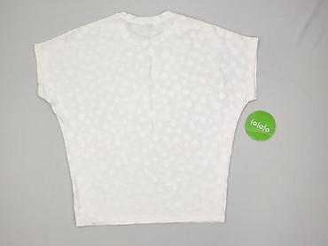Bluzka damska z krótkim rękawem - Fason: luźny, z opuszczonym ramieniem; lekko zaokrąglony dół (tył nieco dłuższy) - Dekolt: okrągły - Wzór: drobne kropki na jasnym tle (efekt „mini dalmatian”) - ...