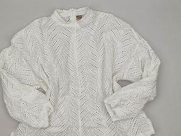 Bluzka damska, biała, rozmiar L. - Krój: prosty, z okrągłym dekoltem - Rękawy: długie, bufiaste z szerokim marszczonym ściągaczem przy mankietach - Detale: pionowa, koronkowa wstawka z przodu; sub...