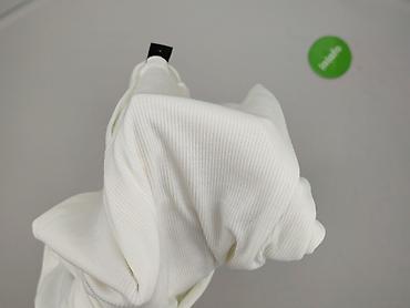 Biała bluzka damska z krótkim rękawem i fakturą „waffle”. - Krój: luźny, lekko opadające rękawy z podwiniętymi brzegami - Dekolt: w kształcie litery V z krótką listwą zapinaną na 2 dekoracyjne, dr...