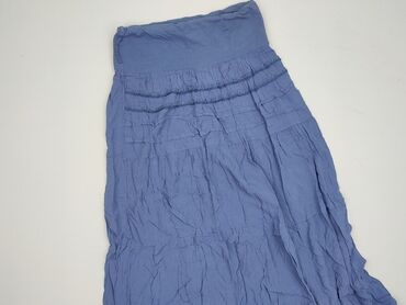 Jasnoniebieska, długa spódnica z przewiewnego materiału (len/bawełna – na zdjęciu widać naturalną fakturę). - Fason: midi/maxi, lekko rozkloszowany. - Talia: szeroki, marszczony pas z gumką zapew...