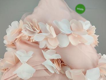Sukienka dziewczęca w kolorze pudrowego różu z krótkim rękawem. Elegancki krój z odcięciem w talii, trzema ozdobnymi przeszyciami i małą, połyskującą klamerką z przodu. Dół rozkloszowany z lekką, tiulową warstwą. Rękawki oraz dolna krawędź spódnicy bogato zdobione trójwymiarowymi aplikacjami kwiatów w odcieniach różu i bieli. Z tyłu długie troki do wiązania w pasie, umożliwiające dopasowanie sylwetki. Materiał gładki, miękko układający się. Delikatnie wizytowy charakter – idealna na uroczystości, przyjęcia, występy szkolne czy rodzinne święta. Drobne, ledwie widoczne zaciągnięcia materiału pokazane na zbliżeniach.