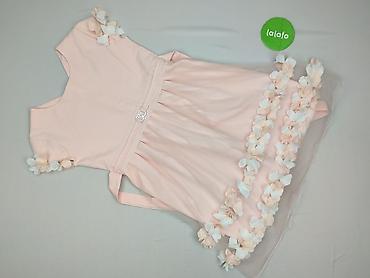 Sukienka dziewczęca w kolorze jasnoróżowym z koronkową fakturą. - Krój: dopasowana góra, rozkloszowany dół. - Rękawy: krótkie, półprzezroczyste z tej samej koronkowej tkaniny. - Dekolt: okrągły z ...