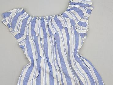 Bluzka damska w paski, hiszpanka - Krój: hiszpanka z szeroką, falbanową listwą przy dekolcie; można nosić na odkryte ramiona - Wzór: pionowe paski w odcieniach bieli i jasnego granatu/niebieskiego...
