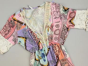 Sukienka damska M – kolorowy wzór patchwork z koronką - Rozmiar: M (metka widoczna na zdjęciu) - Krój: kopertowy dekolt V, talia podkreślona, dół z delikatnym zaokrągleniem - Rękawy: szerokie, dłu...