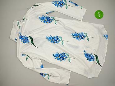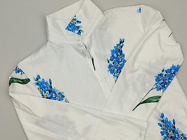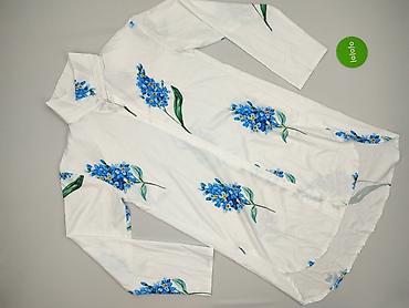 Damska koszula-sukienka z długim rękawem, biała, z nadrukiem niebieskich kwiatów (bukiety z żółtymi środkami i zielonymi liśćmi). Klasyczny kołnierz stójka, zapięcie na guziki na całej długości. Fason lekko oversize, wydłużony tył i zaokrąglone brzegi, dzięki czemu można nosić ją jako tunikę lub samodzielną koszulową sukienkę. Materiał gładki, lekki, przyjemny w dotyku; dobrze trzyma formę. Rękawy proste, mankiety zapinane na guzik. Wyrazisty, akwarelowy wzór dodaje świeżości i sprawdzi się zarówno do jeansów, jak i do eleganckich stylizacji. Kolor dominujący: biały; wzór: kwiaty w odcieniach niebieskiego z zielenią. Idealna na wiosnę i lato.