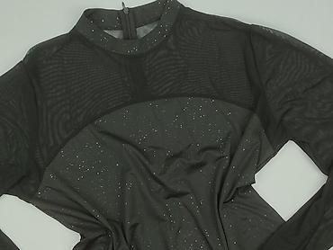 Sukienka damska, czarna, z połyskującą nitką - Krój: dopasowany, mini, z krótkim rękawem - Dekolt: łódka - Materiał: elastyczna dzianina; przód i większa część tyłu pokryte drobną, metaliczną nitk...