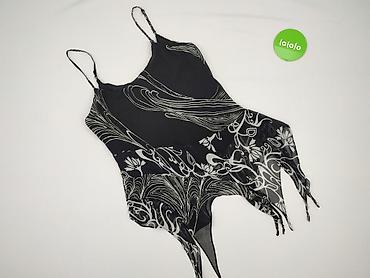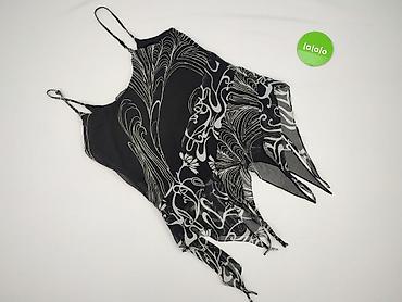 Czarna sukienka damska z lekkiego, zwiewnego materiału. - Fason: bez rękawów, góra z łagodnym dekoltem; w talii wszyta gumka podkreślająca sylwetkę. - Dół: warstwowy, asymetryczny z dłuższymi, s...